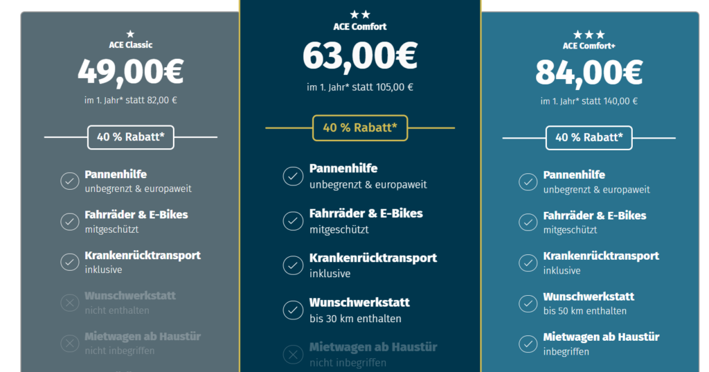 Wichtiger Hinweis: Die genannten Preise und Leistungen beziehen sich auf den Stand März 2026. Es empfiehlt sich, vor Abschluss direkt auf der Website des ACE nach aktuellen Aktionsangeboten (z. B. Rabatte für Neumitglieder im ersten Jahr) zu schauen.